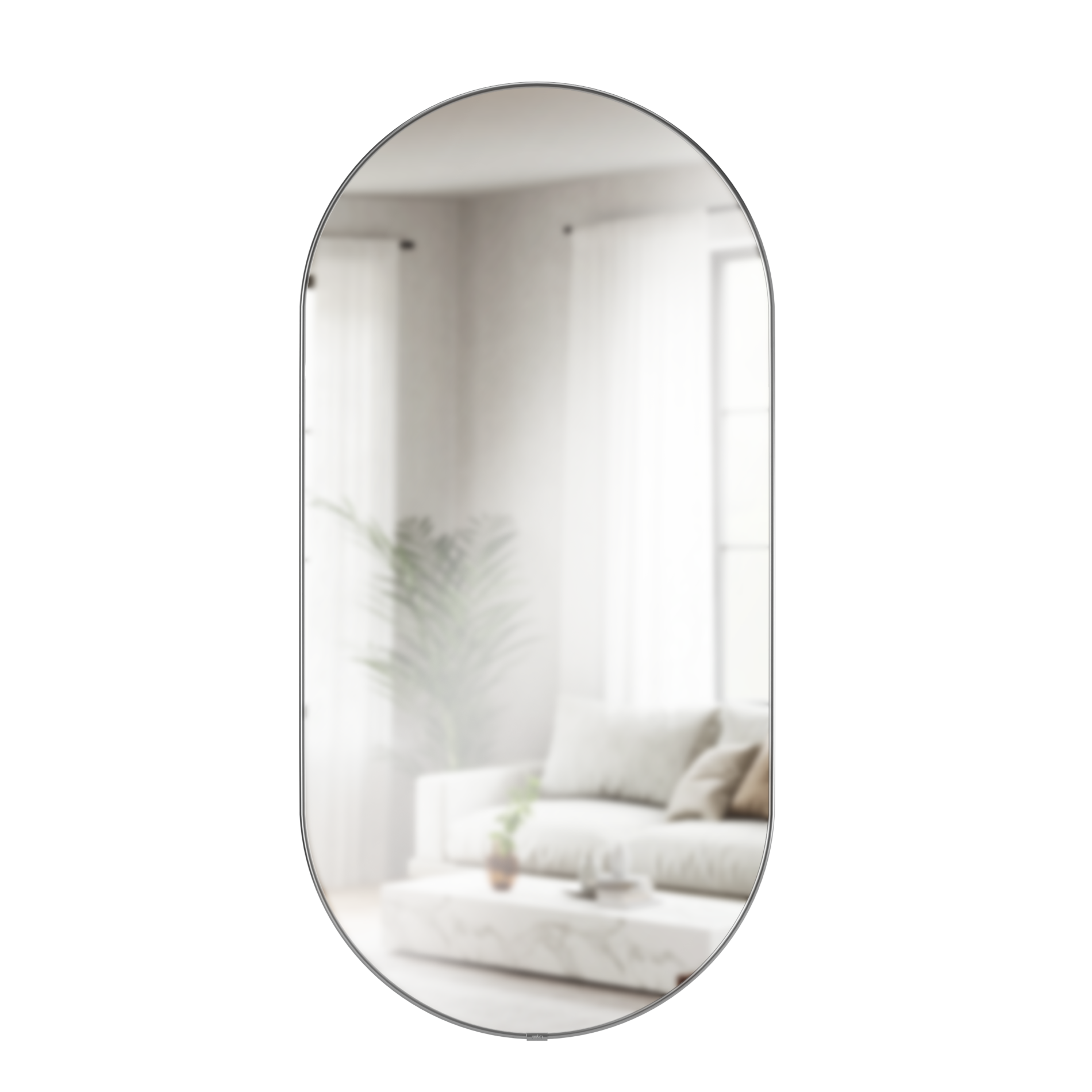 The Hubba Pill Mirror brings a warm, modern touch to your walls while instantly opening up your space. Its elongated pill shape draws the eye and reflects light beautifully, making rooms feel brighter and more spacious. With a thin metallic frame that adds just the right amount of shine, Hubba works perfectly above a console, in a hallway, or as a statement piece in your bedroom. Measures 18 x 36 x 1.6' (45 x 91 x 4 cm). Easy to install and comes with all necessary mounting hardware.