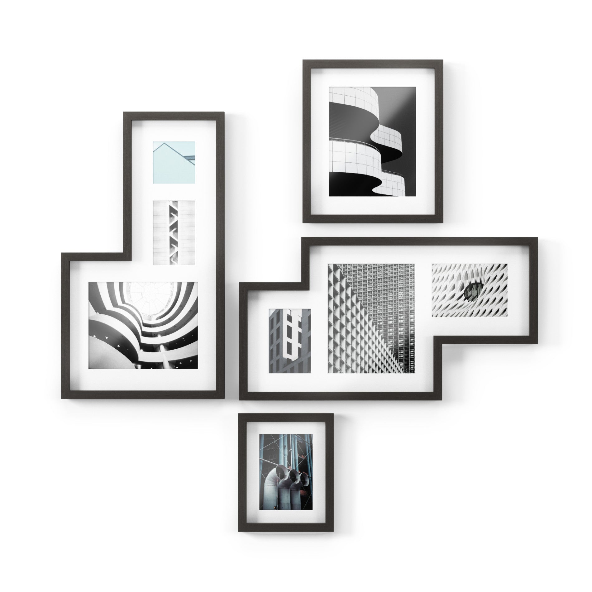 A gallery set with picture frames that perfectly complement one another, Mingle features 4 uniquely shaped frames, each with various matboard sizes, including, one 4x4, two 4x6, two 5x7 and three 8x10. This one-of-a-kind picture display can be arranged in multiple configurations to suit your preference and space. Create a beautiful statement on any wall in your home, by using various pictures, mementoes, artwork and more. Measures 27.25 x 3.25 x 15.13' (69 x 8 x 38 cm) altogether. Made with recycled plastics.