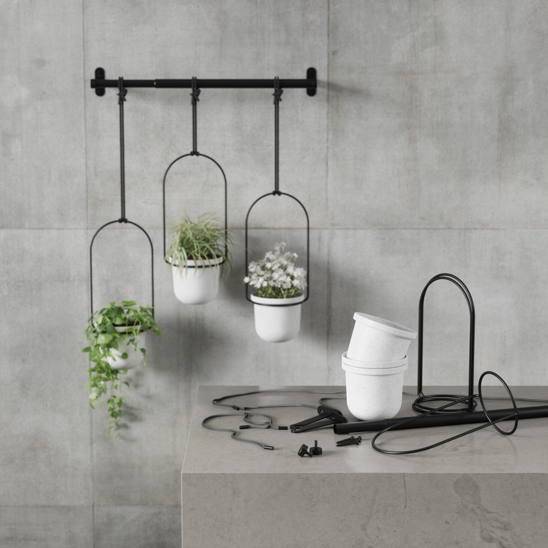 Introducing Triflora, the ultimate indoor hanging planter! It combines the practicality of a drapery rod with the beauty of potted plants. Perfect for herbs, succulents, and vine plants, Triflora hangs on your wall or ceiling and transforms your window into a green oasis. What makes Triflora truly special is its lightweight design. Made from durable recycled molded polypropylene with recycled wood fiber, it stays light even with plants inside, while adding a natural texture to the surface. Don’t let its weight fool you, Triflora can hold up to 15 lbs (6.8 kg) total. You can easily adjust the length of its ropes and slide them anywhere along the metal rod to create your perfect plant arrangement. And there’s no need to repot, Triflora’s pots are designed to fit standard 3-inch (7.6 cm) diameter nursery pots for added convenience. For indoor use, we recommend adding a layer of small pebbles to the bottom of each pot to encourage drainage and help keep your plants healthy. For outdoor use, you can drill a small hole in the base of each pot to allow water to drain freely. Triflora is suitable for both wall and ceiling mounting and fits any standard 24-inch (61 cm) window. Measures 25 x 5.75 x 43.5 inches (64 x 15 x 110 cm). Made with recycled plastics.